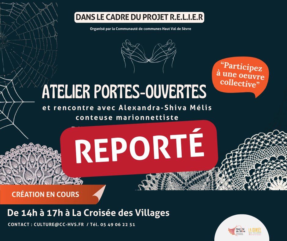Cet atelier s’inscrit dans le projet R.E.L.I.E.R, porté par la Communauté de communes Haut Val de Sèvre. Cette démarche artistique explore les thèmes du lien, de la transmission et de la mémoire à travers la réalisation d’une grande marionnette textile construite à partir de napperons, objets souvent porteurs d’histoires familiales.